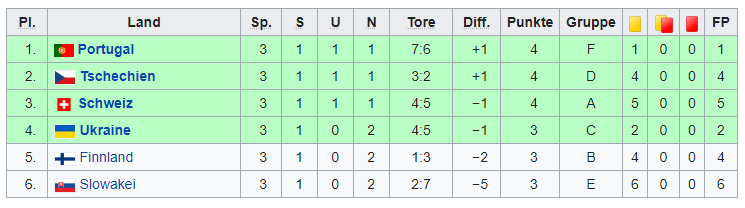 | Die Dritten aus den Gruppenspielen Fussball-Europameisterschaft 2021 / Wikipedia Es gibt sechs Gruppen Dritte. Die vier Besten davon kommen weiter. |