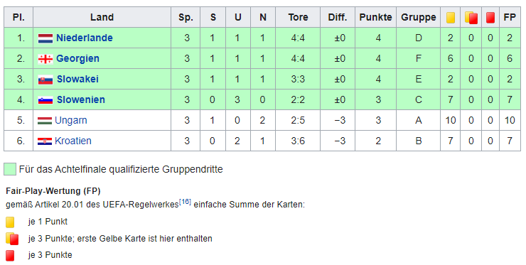 | Die Dritten aus den Gruppenspielen Es gibt sechs Gruppen Dritte. Die vier Besten davon kommen weiter. Erklärungen siehe: Fußball-Europameisterschaft 2024 – Wikipedia